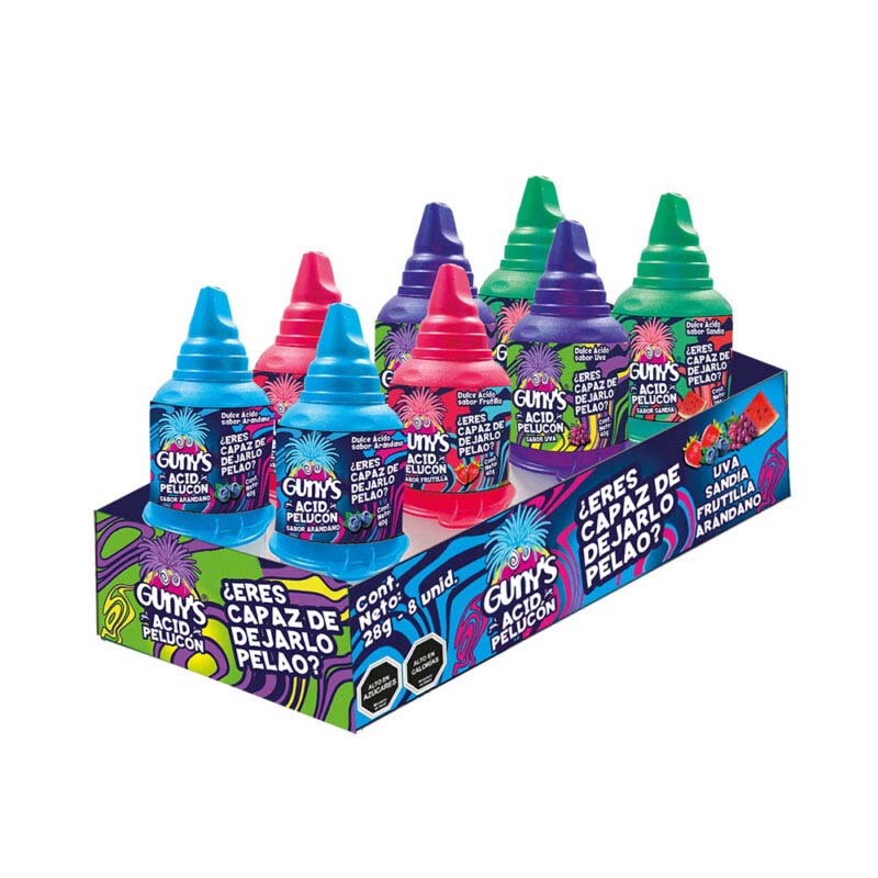 Acid Pelucón de Gunys un dulce ácido de 28g que te llevará a una experiencia divertida al ir girando la parte inferior del dulce irá saliendo el gel acido con exquisito sabor a UVA – SANDÍA – FRUTILLA – ARÁNDANO.