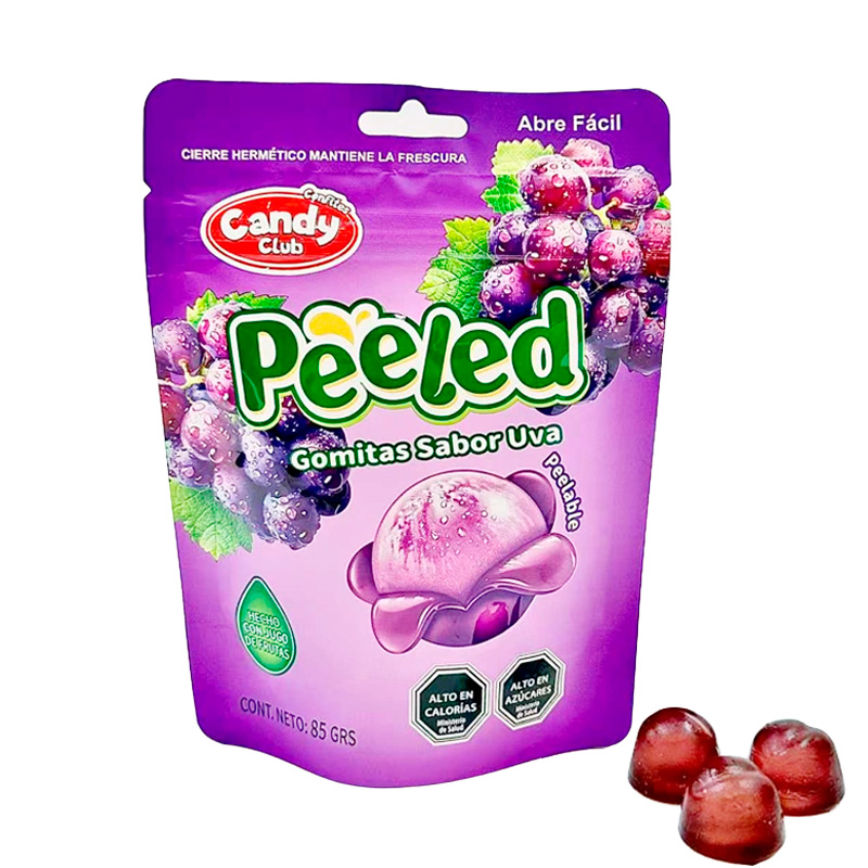 Gomitas Peeled Sabor Uva suaves y ricas con un formato muy entretenido que simula una experiencia casi fantástica al comer capa por capa los gajos.