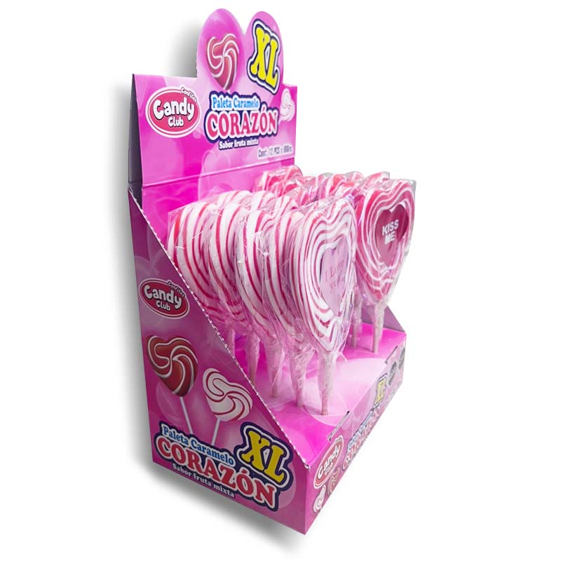 La Paleta Corazón XL se presenta en un gran formato de 80 gramos en forma de corazón, con un exquisito sabor frutal y un diseño en colores rosados, que encantará a grandes y pequeños.
